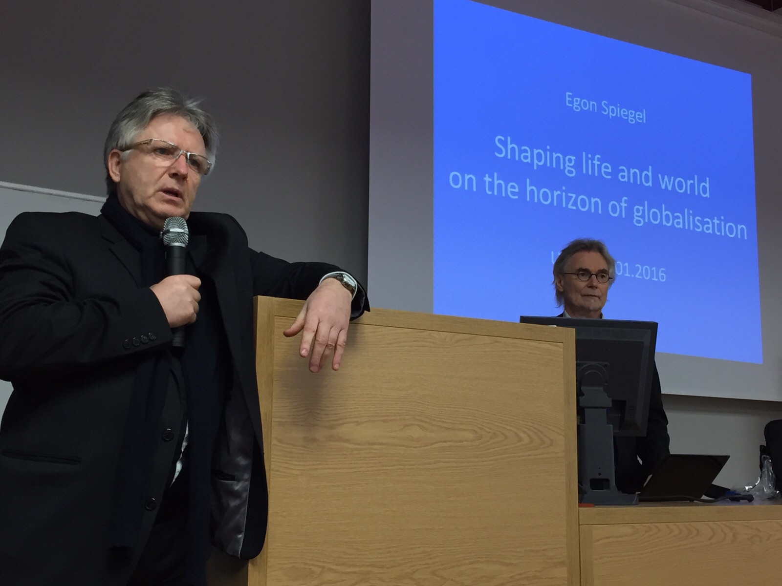 Wykład zatytułowany Shaping life and word on the horizon of globalization (Kształtowanie rzeczywistości w ramach procesów globalizacji), prof. Spiegel wygłosił w języku niemieckim, a tłumaczył go ks. prof. Cyprian Rogowski. Prof. Spiegel wziął również udział w trzech grupach ćwiczeniowych u ks. prof. Cypriana Rogowskiego i w ramach tej samej problematyki nawiązał ze studentami dyskusję w języku angielskim wokół tematyki upowszechniania idei kultury pokoju w świecie. Podkreślił, że kwestia ta powinna być przedmiotem pogłębionych badań w kontekście rozwijającego się dynamicznie ruchu turystycznego. Przy tej okazji pan profesor zaprosił naszych studentów do Vechty i zachęcił ich do realizacji Programu Erasmus i podpisanej umowy bilateralnej między naszymi uczelniami.