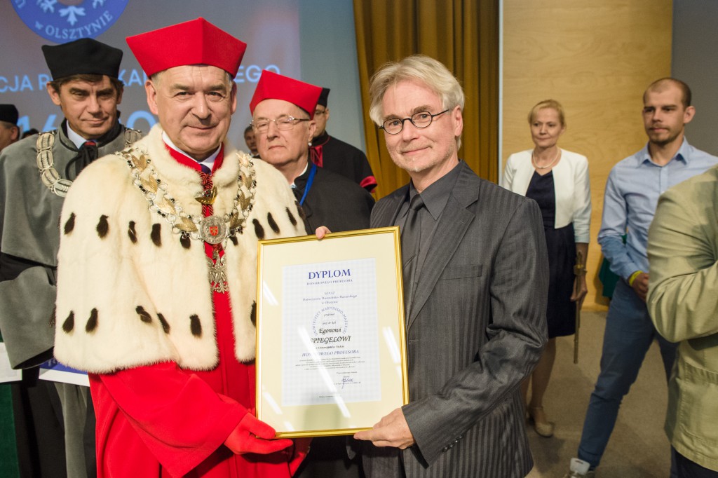 Podczas inauguracji akademickiej 2016/2017 status Profesora Honorowego za wieloletnią współpracę z UWM w Olsztynie otrzymał prof. dr hab. Egon Spiegel z Uniwersytetu w Vechcie. Z wnioskiem o nadanie tego tytułu wystąpiła Rada Wydziału Nauk o Środowisku. Prof. Egon Spiegel ukończył studia teologiczne na Uniwersytecie we Freiburgu, w Marburgu natomiast z politologii, socjologii, psychologii i protestanckiej etyki społecznej. Doktoryzował się i habilitował na Uniwersytecie w Münster. Wykładał na uniwersytetach w Aachen, Münster, Siegen, Gießen i Kolonii. Pierwszą profesurę otrzymał w 1999 roku na Uniwersytecie Technicznym w Dreźnie. Od 2000 roku jest profesorem teologii praktycznej na Uniwersytecie w Vechcie. Od 2003-2010 pracował jako profesor na UWM w Olsztynie. Jako promotor kierował ponad 300 pracami dyplomowymi studentów, pełnił funkcję promotora w 11 przewodach doktorskich i 3 habilitacyjnych jako recenzent. Promuje młodą kadrę naukową, zwłaszcza poprzez wyjątkowe prace dyplomowe napisane na wysokim poziomie pod jego kierunkiem. Jego główne zainteresowania naukowe koncentrują się przede wszystkim na pionierskim podejściu do badań socjo-teologicznych, z zakresu problematyki wychowania do pokoju i kulturoznawczej, a także obszarów społecznych i etycznych. Jego publikacje dostępne są w języku niemieckim, polskim, chińskim, angielskim, włoskim i portugalskim. Jest członkiem komitetów redakcyjnych i rad naukowych w czasopismach specjalistycznych, krajowych i zagranicznych. Oprócz swoich długoletnich i licznych pobytów na wykładach na UWM w Olsztynie (od 2003), wizytował w ramach badań naukowych i wykładów w USA, m.in. na University of California, Berkeley i Kanadzie, University, Faculty of Religious Studies (Montréal), na 17 Uniwersytetach w Chinach, zwłaszcza na Uniwersytecie Nanjing. Ponadto prowadził badania naukowe i wykłady na różnych Uniwersytetach w Korei Południowej, Brazylii i Japonii. Prof. Spiegel kultywuje interdyscyplinarną współpracę z koleżankami i kolegami reprezentującymi nauki o wychowaniu, psychologię, medycynę, kooperuje też na płaszczyźnie pozauniwersyteckiej z lokalnymi szkołami, szpitalem (jako pedagog) i firmą turystyczną Höffmann-Reisen. Nawiązał współpracę polsko-niemiecką, zapraszając do niej w 1999 roku ks. prof. dra hab. Cypriana Rogowskiego do Drezna. Jest współredaktorem założonego przez Rogowskiego międzynarodowego trójjęzycznego specjalistycznego czasopisma pedagogicznoreligijnego KERYKS. Współpracował przy tworzeniu Leksykonu i Podręcznika Akademickiego Pedagogiki Religii autorstwa C. Rogowskiego, współorganizuje wyjazdy dla studentów i doktorantów do innych uczelni, trzy razy przedłużył umowy bilateralne o kooperacji międzynarodowej między University of Vechta i UWM w Olsztynie oraz umowy w ramach Erasmusa. W ramach współpracy, prof. Rogowski prowadzi sukcesywnie wykłady na Uniwersytecie w Vechcie, jak również kieruje tam pracami dyplomowymi (Bachelor i Master) oraz jest powoływany na promotora prac doktorskich i jako recenzent w przewodzie habilitacyjnym. Spiegel realizował razem z Rogowskim w UWM w Olsztynie pierwszy polsko-niemiecki Kongres Pedagogów Religii, współfinansowany przez naukową Fundację (Deutsch-Polnische Wissenschaftsstiftung). W realizacji tego przedsięwzięcia wzięli udział prof. Annette M. Stross z Wyższej Szkoły Pedagogicznej w Karlsruhe, prof. Martin Jaeggle i prof. Andrea Lehner Hartmann (Uniwersytet Wiedeński), ks. prof. Janusz Mariański (Katolicki Uniwersytet Lubelski Jana Pawła II. Współpraca z prof. Liu Cheng (Nanjing University, Chiny), prof. L. Kurtz (George Mason University, USA) i prof. Michael Nagler (University of California, Berkeley, USA) zarysowała perspektywy w realizowaniu projektu o charakterze kulturoznawczym na Wydziale Nauk o Środowisku UWM w Olsztynie, promującego Warmię i Mazury jako region o szczególnych walorach turystycznych, włączając w niego kontekst globalny "Kultury Pokoju i Nieagresji dla dzieci Świata" (ONZ). Jako ciekawostka: posiada amerykańską licencję pilota w trzech specjalnościach, którą zgodnie z procedurami odnawia co dwa lata, zdając w Los Angeles przewidziany w tym zakresie teoretyczny i praktyczny egzamin.