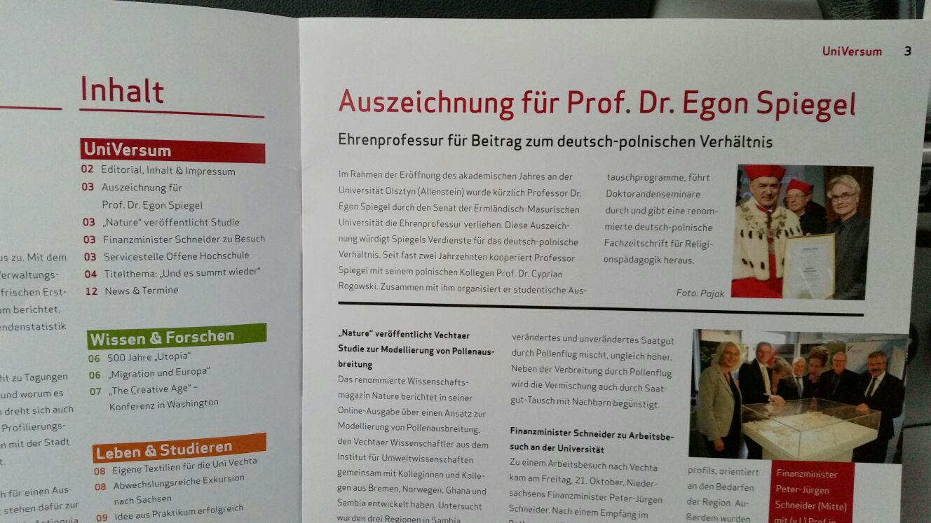 Fast zwei Jahrzehnte kooperiert Professor Dr. Egon Spiegel mit seinem polnischen Kollegen Prof. Dr. Cyprian Rogowski von der Universität Olsztyn (Allenstein). Die Breite und Intensität dieser Kooperation und seine Verdienste für das deutsch-polnische Verhältnis wurden jetzt vom Senat der Ermländisch-Masurischen Universität Allenstein durch die Verleihung einer Ehrenprofessur gewürdigt. Die durch den Rektor der polnischen Universität, Prof. Dr. Ryszard J. Gorecki, am 30. September 2016 vorgenommene Auszeichnung bestätigt zugleich die internationalen Ausrichtung der Universität Vechta, die auf der Basis eines seit 2004 existierenden bilateralen Vertrages mit der Universität Olsztyn sowie eines Erasmusvertrages die Kooperation von Anfang an begrüßt und gefördert hat. Lange Jahre fungierte Spiegel als Titularprofessor an der Theologischen Fakultät der Allensteiner Universität, heute ist er Visiting Professor am Lehrstuhl für Sakrotourismus seines Kollegen Rogowski in der Umweltwissenschaftlichen Fakultät. Mit seinem polnischen Kollegen organisiert er studentische Austauschprogramme, führt Doktorandenseminare durch und gibt eine renommierte deutsch-polnische Fachzeitschrift für Religionspädagogik heraus.