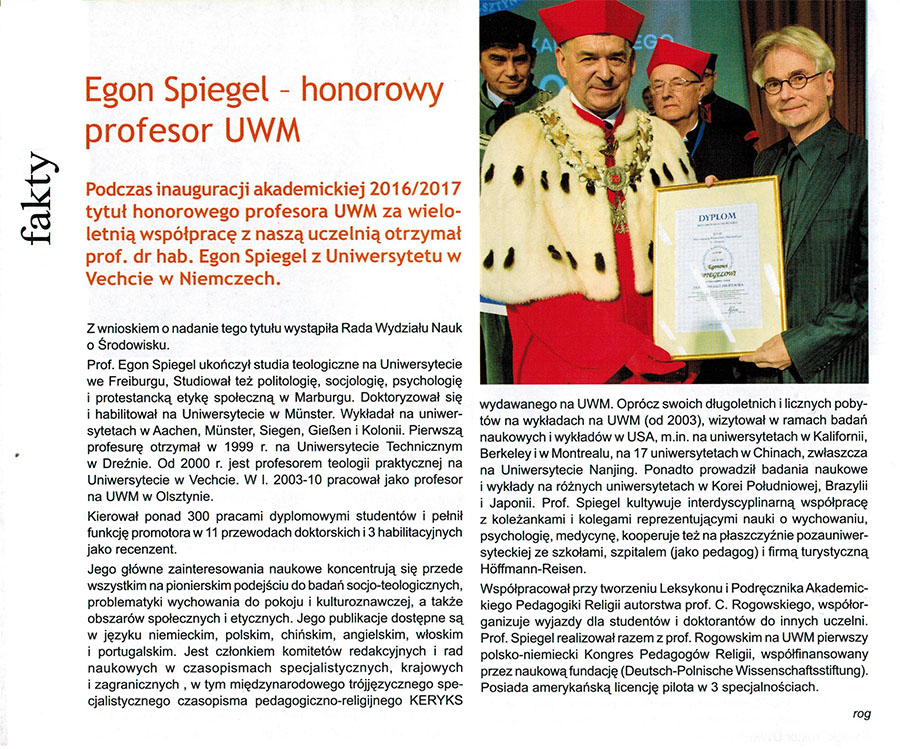 Podczas inauguracji akademickiej 2016/2017 status Profesora Honorowego za wieloletnią współpracę z UWM w Olsztynie otrzymał prof. dr hab. Egon Spiegel z Uniwersytetu w Vechcie. Z wnioskiem o nadanie tego tytułu wystąpiła Rada Wydziału Nauk o Środowisku. Prof. Egon Spiegel ukończył studia teologiczne na Uniwersytecie we Freiburgu, w Marburgu natomiast z politologii, socjologii, psychologii i protestanckiej etyki społecznej. Doktoryzował się i habilitował na Uniwersytecie w Münster. Wykładał na uniwersytetach w Aachen, Münster, Siegen, Gießen i Kolonii. Pierwszą profesurę otrzymał w 1999 roku na Uniwersytecie Technicznym w Dreźnie. Od 2000 roku jest profesorem teologii praktycznej na Uniwersytecie w Vechcie. Od 2003-2010 pracował jako profesor na UWM w Olsztynie. Jako promotor kierował ponad 300 pracami dyplomowymi studentów, pełnił funkcję promotora w 11 przewodach doktorskich i 3 habilitacyjnych jako recenzent. Promuje młodą kadrę naukową, zwłaszcza poprzez wyjątkowe prace dyplomowe napisane na wysokim poziomie pod jego kierunkiem. Jego główne zainteresowania naukowe koncentrują się przede wszystkim na pionierskim podejściu do badań socjo-teologicznych, z zakresu problematyki wychowania do pokoju i kulturoznawczej, a także obszarów społecznych i etycznych. Jego publikacje dostępne są w języku niemieckim, polskim, chińskim, angielskim, włoskim i portugalskim. Jest członkiem komitetów redakcyjnych i rad naukowych w czasopismach specjalistycznych, krajowych i zagranicznych. Oprócz swoich długoletnich i licznych pobytów na wykładach na UWM w Olsztynie (od 2003), wizytował w ramach badań naukowych i wykładów w USA, m.in. na University of California, Berkeley i Kanadzie, University, Faculty of Religious Studies (Montréal), na 17 Uniwersytetach w Chinach, zwłaszcza na Uniwersytecie Nanjing. Ponadto prowadził badania naukowe i wykłady na różnych Uniwersytetach w Korei Południowej, Brazylii i Japonii. Prof. Spiegel kultywuje interdyscyplinarną współpracę z koleżankami i kolegami reprezentującymi nauki o wychowaniu, psychologię, medycynę, kooperuje też na płaszczyźnie pozauniwersyteckiej z lokalnymi szkołami, szpitalem (jako pedagog) i firmą turystyczną Höffmann-Reisen. Nawiązał współpracę polsko-niemiecką, zapraszając do niej w 1999 roku ks. prof. dra hab. Cypriana Rogowskiego do Drezna. Jest współredaktorem założonego przez Rogowskiego międzynarodowego trójjęzycznego specjalistycznego czasopisma pedagogicznoreligijnego KERYKS. Współpracował przy tworzeniu Leksykonu i Podręcznika Akademickiego Pedagogiki Religii autorstwa C. Rogowskiego, współorganizuje wyjazdy dla studentów i doktorantów do innych uczelni, trzy razy przedłużył umowy bilateralne o kooperacji międzynarodowej między University of Vechta i UWM w Olsztynie oraz umowy w ramach Erasmusa. W ramach współpracy, prof. Rogowski prowadzi sukcesywnie wykłady na Uniwersytecie w Vechcie, jak również kieruje tam pracami dyplomowymi (Bachelor i Master) oraz jest powoływany na promotora prac doktorskich i jako recenzent w przewodzie habilitacyjnym. Spiegel realizował razem z Rogowskim w UWM w Olsztynie pierwszy polsko-niemiecki Kongres Pedagogów Religii, współfinansowany przez naukową Fundację (Deutsch-Polnische Wissenschaftsstiftung). W realizacji tego przedsięwzięcia wzięli udział prof. Annette M. Stross z Wyższej Szkoły Pedagogicznej w Karlsruhe, prof. Martin Jaeggle i prof. Andrea Lehner Hartmann (Uniwersytet Wiedeński), ks. prof. Janusz Mariański (Katolicki Uniwersytet Lubelski Jana Pawła II. Współpraca z prof. Liu Cheng (Nanjing University, Chiny), prof. L. Kurtz (George Mason University, USA) i prof. Michael Nagler (University of California, Berkeley, USA) zarysowała perspektywy w realizowaniu projektu o charakterze kulturoznawczym na Wydziale Nauk o Środowisku UWM w Olsztynie, promującego Warmię i Mazury jako region o szczególnych walorach turystycznych, włączając w niego kontekst globalny "Kultury Pokoju i Nieagresji dla dzieci Świata" (ONZ). Jako ciekawostka: posiada amerykańską licencję pilota w trzech specjalnościach, którą zgodnie z procedurami odnawia co dwa lata, zdając w Los Angeles przewidziany w tym zakresie teoretyczny i praktyczny egzamin.