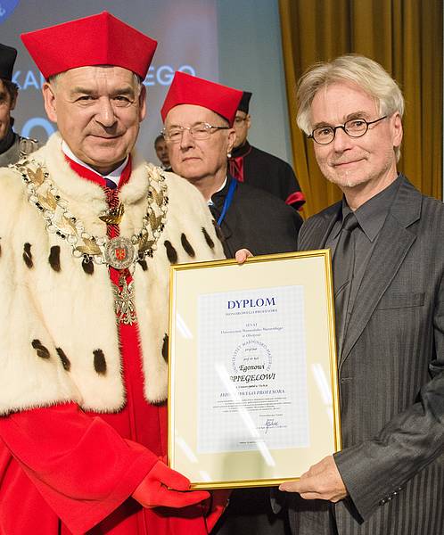 Fast zwei Jahrzehnte kooperiert Professor Dr. Egon Spiegel mit seinem polnischen Kollegen Prof. Dr. Cyprian Rogowski von der Universität Olsztyn (Allenstein). Die Breite und Intensität dieser Kooperation und seine Verdienste für das deutsch-polnische Verhältnis wurden jetzt vom Senat der Ermländisch-Masurischen Universität Allenstein durch die Verleihung einer Ehrenprofessur gewürdigt. Die durch den Rektor der polnischen Universität, Prof. Dr. Ryszard J. Gorecki, am 30. September 2016 vorgenommene Auszeichnung bestätigt zugleich die internationalen Ausrichtung der Universität Vechta, die auf der Basis eines seit 2004 existierenden bilateralen Vertrages mit der Universität Olsztyn sowie eines Erasmusvertrages die Kooperation von Anfang an begrüßt und gefördert hat. Lange Jahre fungierte Spiegel als Titularprofessor an der Theologischen Fakultät der Allensteiner Universität, heute ist er Visiting Professor am Lehrstuhl für Sakrotourismus seines Kollegen Rogowski in der Umweltwissenschaftlichen Fakultät. Mit seinem polnischen Kollegen organisiert er studentische Austauschprogramme, führt Doktorandenseminare durch und gibt eine renommierte deutsch-polnische Fachzeitschrift für Religionspädagogik heraus.