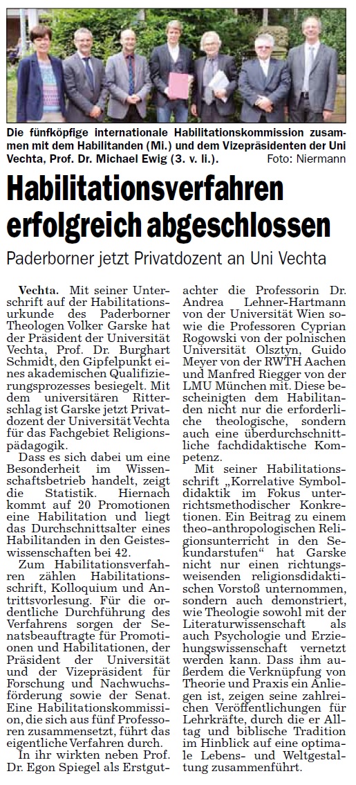 Międzynarodowy skład komisji w przewodzie habilitacyjnym dra Volker Garske. Na zdjęciu od lewej: Prof. Dr. Andrea Lehner-Hartmann z Uniwersytetu w Wiedniu (Austria), Prof. Dr. Guido Meyer z Uniwersytetu w Aachen (Niemcy), Prof. Dr. Michael Ewig - wiceprezydent Uniwersytetu w Vechcie (Niemcy), nowohabilitowany Docent Uniwersytetu w Vechcie Volker Garske (Niemcy), Prof. Dr. Egon Spiegel z Uniwersytetu w Vechcie (Niemcy), Prof. Dr. Cyprian Rogowski z Uniwersytetu Warmińsko-Mazurskiego w Olsztynie (Polska), Prof. Dr. Manfred Riegger z Uniwersytetu w Monachium (Niemcy).